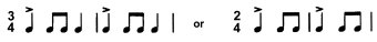 The second group includes chants and dances of the Dervishes and Sayyids. These are more subjective, personal, more deeply emotional. The most typical form in which they are cast is in two parts. First a song, an expression of intimate feeling, often tinged with great sadness. However, these chants, emotionally expressive as they are, never lean even slightly toward the sentimental or self-pitying, but are marked by a great sense of dignity and restraint. Then, in the second part, this quality of feeling is put aside as a dance begins, more outward and with a clear rhythmic pulse. Something of the tone of the first part may subtly linger, but that mood has in essence been abandoned or perhaps resolved in the dance. Even when not set in this two-part form, the Sayyids and Dervishes have the same feeling of inwardness, whether expressed in touching melancholy or in dynamic, powerfully concentrated Dervish dance-movements. These dances are often set in one of the pungent oriental scales like the Turkish Hejaz mode, and are structured on simple, forceful rhythmic patterns such as: