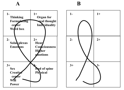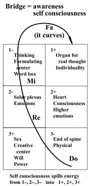 Life starts with sex center (3+), curve passes through 3 (physical), 2 (solar plexus, emotions), and 1 (automatic thinking). B is called the fatal curve in life. At the age of 30 to 40, most people just think of food and sex, taking Curve B. On the descending leg, Curve A passes through 1+ (real thought, individuality), 2+ (consciousness, higher emotions), and 3+ (will power). Begin now, in this moment, to search for the possibility of Curve A. Be aware of voice, movements, postures, gestures, facial expressions, sensations. Eventually you will stop doing things automatically, like a machine. For one week be aware of one thing only. Start with the voice. (I tried it so earnestly and was only able to be aware a few times all week. Its so hard. F.D.S.)